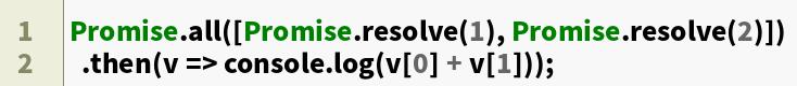 `Promise.all` は配列で解決し、要素の和 `1+2=3` を出力します。
