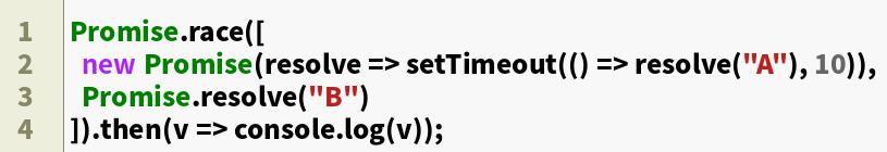 `Promise.resolve(“B”)` は即座に解決するため、`race` の勝者は `”B”` です。