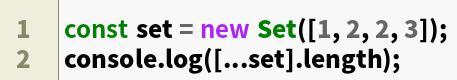 `Set` は重複を保持しません。`[1,2,3]` 相当となり、長さは `3` です。
