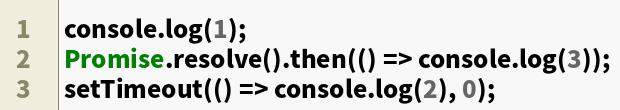 `Promise.then` はマイクロタスク、`setTimeout` はマクロタスクです。同期の `1`、マイクロタスクの `3`、最後にマクロタスクの `2` の順に実行されます。