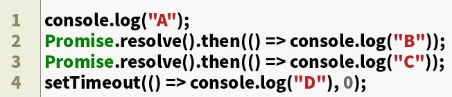 同期ログ `”A”` の後、マイクロタスクの `”B”`, `”C”` が順に実行され、最後にタイマー `”D”` が実行されます。