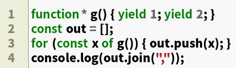ジェネレーター `g` を `for…of` で反復すると `1`、次に `2` が取り出されます。`”1,2″` を出力します。